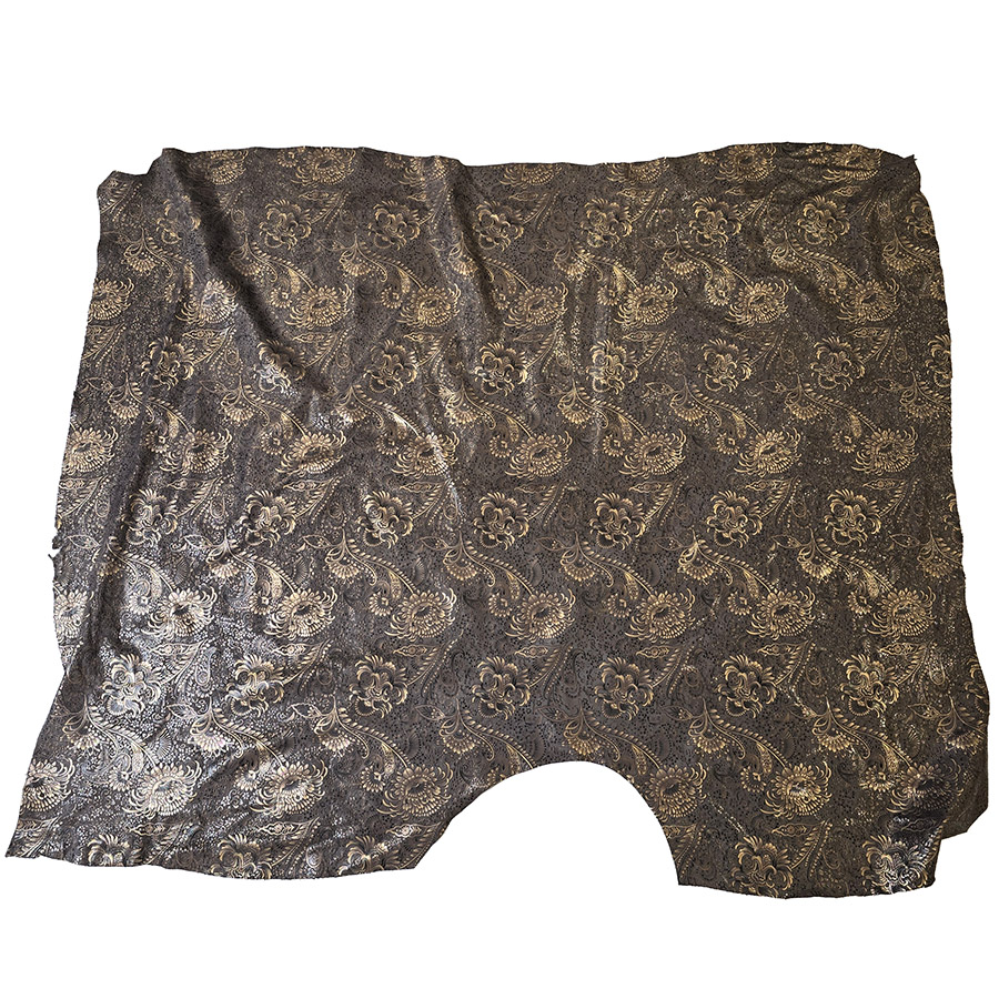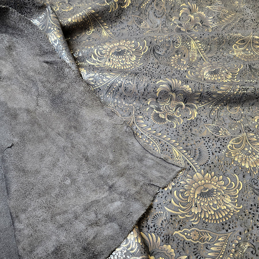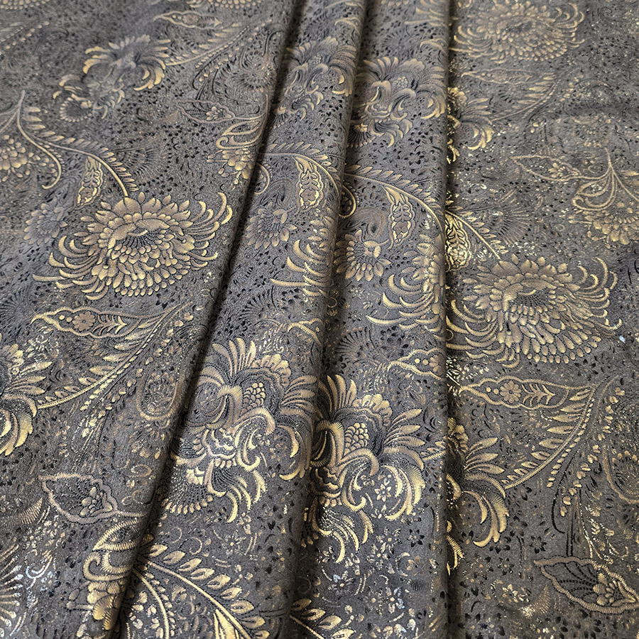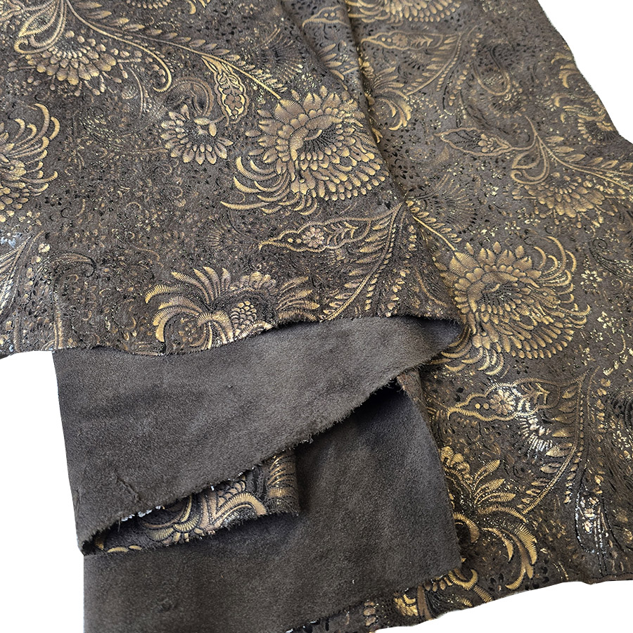 VZOROVANÉ USNĚ – HOVĚZÍ KŮŽE – BRONZOVÉ KVĚTY NA TMAVĚ HNĚDÉM POZADÍ – 0.6-0.8 mm